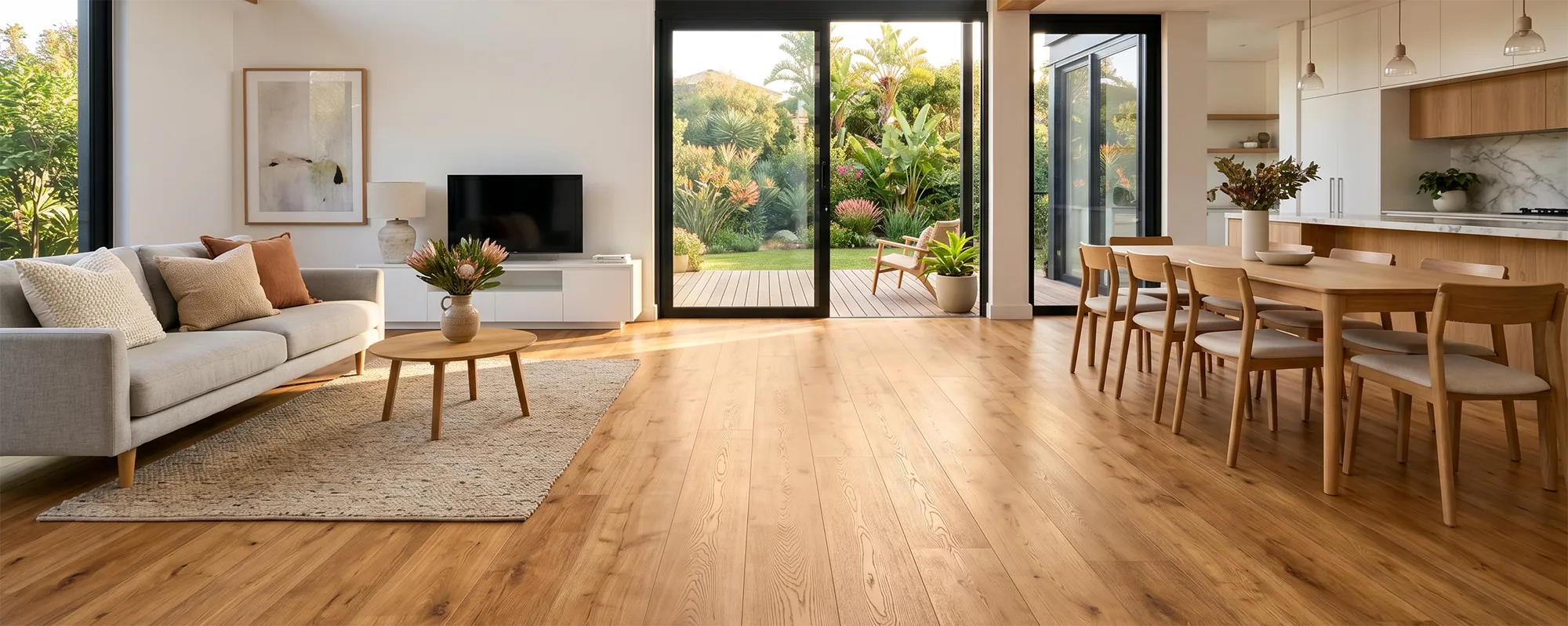 Longer planks (1800mm+) look more like real timber and have fewer end joints in a room. Standard lengths are 1200mm–1380mm in budget ranges. Width follows the same logic — standard is 180mm–200mm, extra-wide boards (230mm–245mm) feel more premium and suit larger open-plan spaces.
